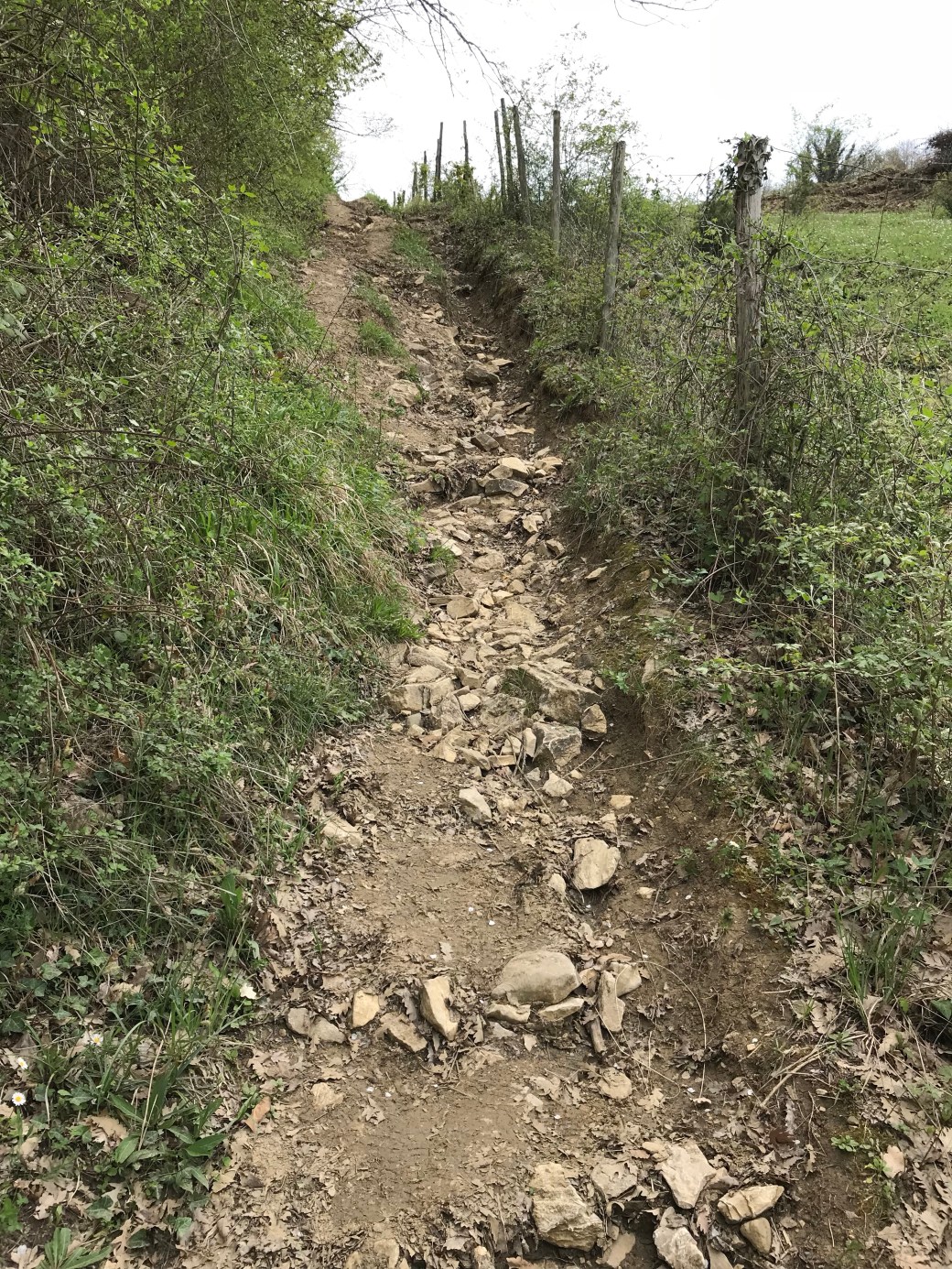 Suis partie ce matin vers 9h après une bonne nuit de sommeil. La sortie de Gubbio a été facile: le Chemin est bien balisé. Quelques défis en cours de route! Les surfaces de marche ont été variées avec kms en asphalte, sentiers en forêt dont certains très boueux et trois ruisseaux à traverser à gué.