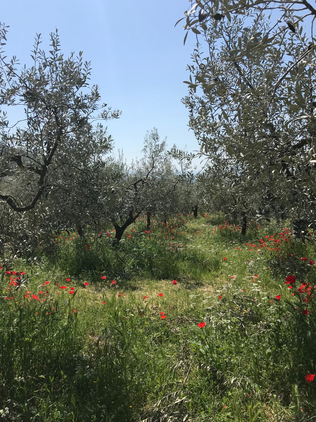 Mais le tout en valait la peine parce que le décor était varié. Le Chemin en partie sur l’asphalte , une autre dans le bois ce qui était bienvenu parce qu’il avait peu d’ombre en ville. Je me suis promenée dans les oliveraies et les vignes parmi les coquelicots en fleurs ce qui donne un paysage éblouissant.