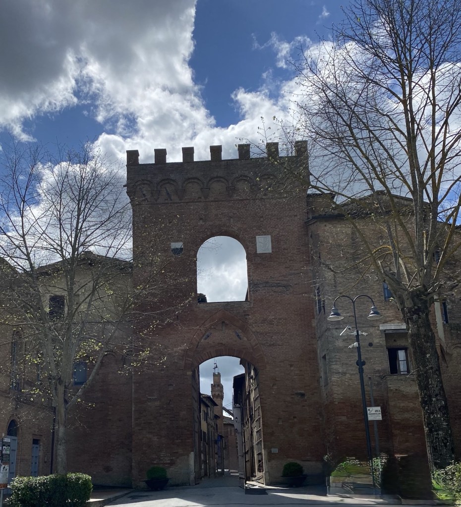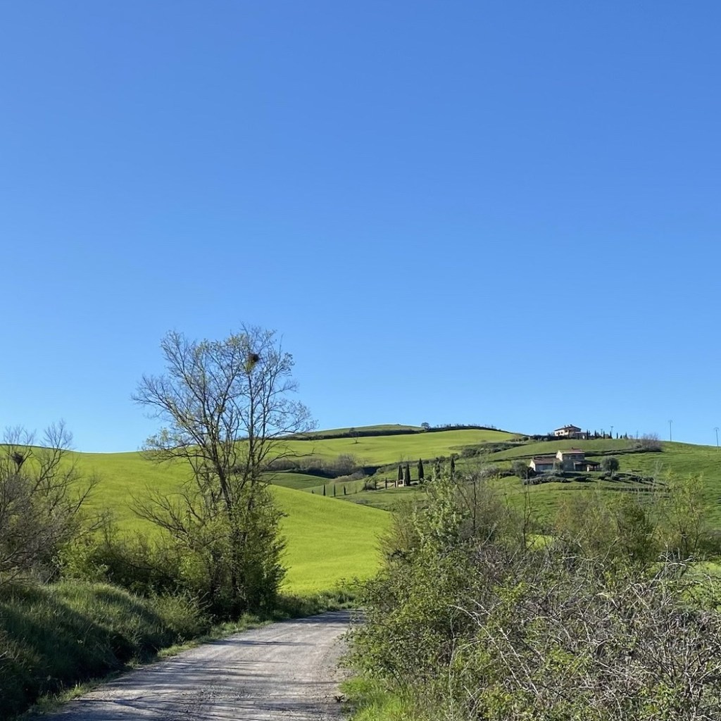 C’est sous un ciel nuageux que j’arrive à la ville médiévale de Buonconvento développée grâce au passage de la Via Francigena qui fait partie des plus beaux villages d’Italie. À la sortie de la ville, l’autoroute m’attend pendant quelques kms puis le chemin de gravel d’où j’aperçois une cour d’école et une peu plus loin des blocks appartements, c’est la banlieue.