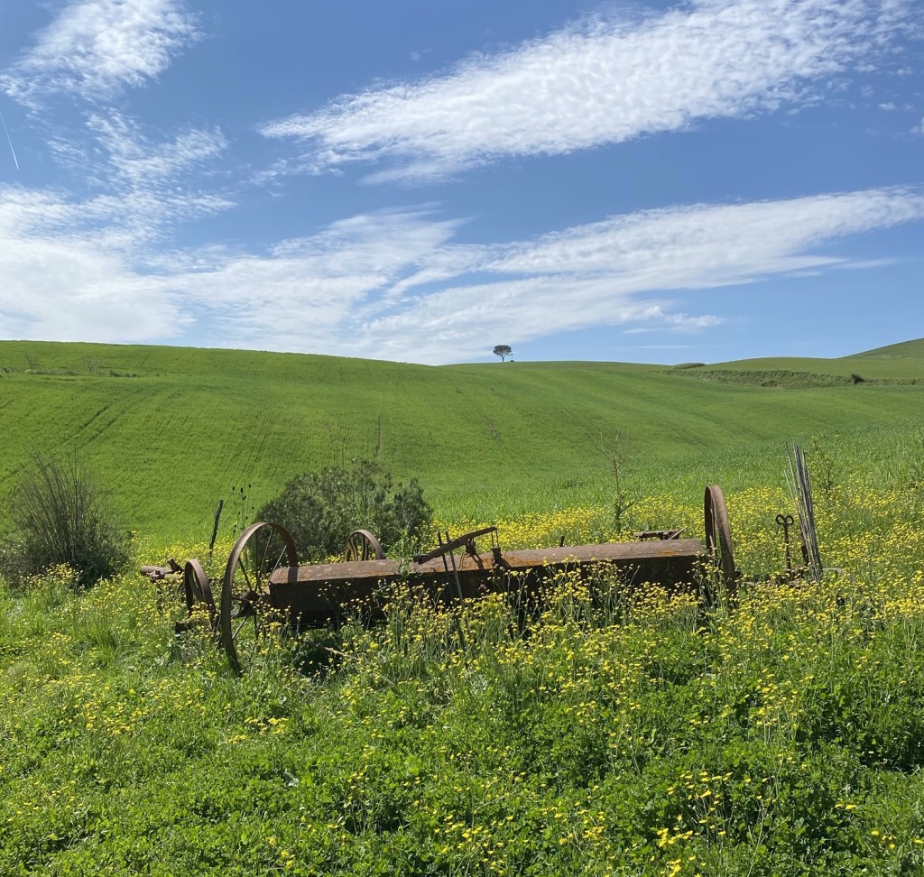 L’étape débute sur l’asphalte durant une dizaine de kms. Puis à ma droite, un chemin de terre où je découvre la campagne verdoyante de La Vallée d’Elsa mais il y a un prix à payer car il y a plusieurs montées et descentes. C’est la campagne toscane avec ses paysages magnifiques où on aperçoit plusieurs parcelles de vignes.