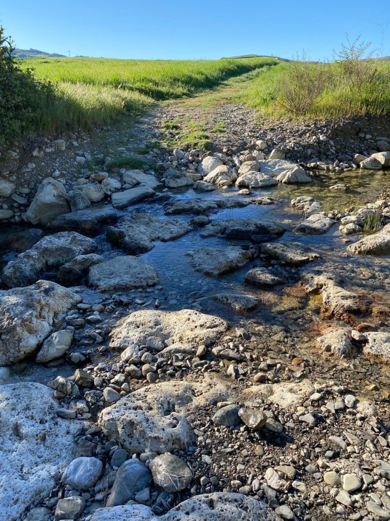 Sorties du Camping à droite, nous empruntons un chemin de gravier pente descendante . Au loin sur un terrain vallonneux se dessinent des vignobles, oliveraies et ruisseaux. Cette partie de l’étape est d’une beauté extrême. Tout autour de nous, couleurs vives du bleu du ciel, les verts des arbres contrastent avec le chemin blanc.