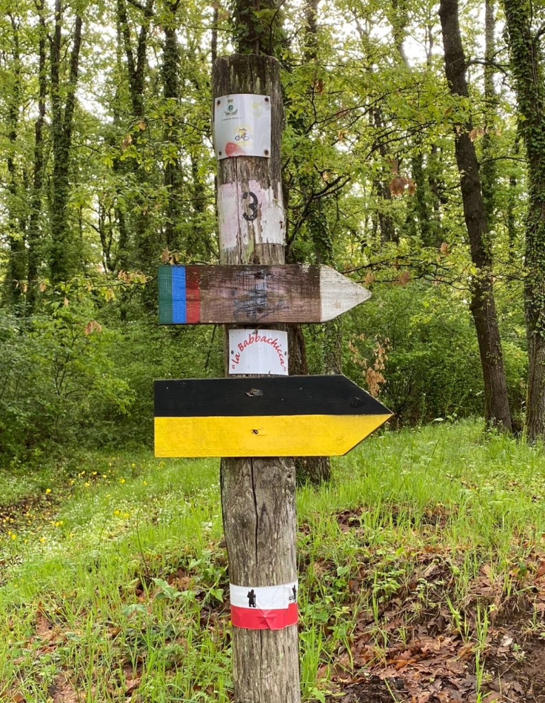 La piste s’ouvre sur une forêt de chênes et de noyers. Ici, le marcheur doit faire preuve d’une grande vigilance puisque le virus de la peste porcine (porc, sanglier) déjà présent dans le nord de l’Italie et la VF, traverse des régions touchées ou proches des zones d’épidémie comme Le Latium (Rome) où je marche présentement. Pour limiter les dégâts et la propagation du virus, les associations de chasseurs font des campagnes régulières de “prélèvements” de sangliers.